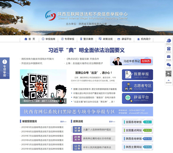 陜西省網(wǎng)絡(luò)舉報(bào)中心官網(wǎng)“陜西互聯(lián)網(wǎng)違法和不良信息舉報(bào)中心”網(wǎng)站上線于2017年2月5日,主要功能是開展網(wǎng)絡(luò)舉報(bào)工作宣傳,受理網(wǎng)民對(duì)網(wǎng)絡(luò)違法和不良信息舉報(bào),開展針對(duì)網(wǎng)絡(luò)謠言的識(shí)謠辟謠工作,以及配合相關(guān)部門做好網(wǎng)絡(luò)輿情的正面引導(dǎo)。“陜西網(wǎng)絡(luò)聯(lián)合辟謠平臺(tái)”是陜西網(wǎng)絡(luò)辟謠聯(lián)盟的官方網(wǎng)站,上線于2017年7月28日,主要用于宣傳、受理和發(fā)布重要辟謠信息及公布相關(guān)工作數(shù)據(jù)。