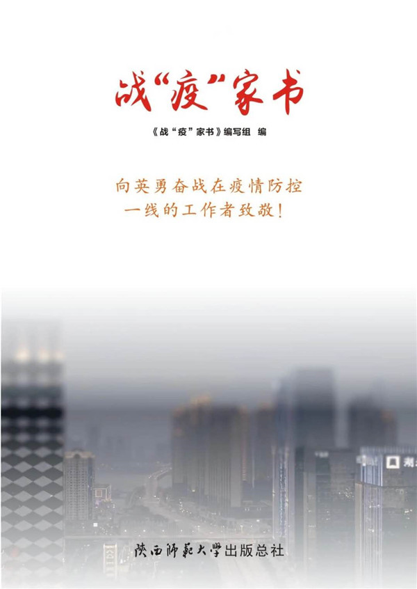 陜西師大出版總社積極響應(yīng)、主動(dòng)作為,全國首推《戰(zhàn)“疫”家書》一書,用文字和圖片生動(dòng)記錄了一封封戰(zhàn)“疫”家書,講述抗疫一線的感人事跡,訴說著“白衣戰(zhàn)士”等平凡英雄內(nèi)心深處的真情與大愛。微信短信,手機(jī)里有字里行間的情感流露,見字如面,紙短情長。家書中,有難舍的牽掛,有家人的囑托,有醫(yī)務(wù)工作者“健康所系,性命相托”的莊嚴(yán)承諾,更有用無比的勇氣和斗志奔赴抗疫戰(zhàn)場的家國情懷。