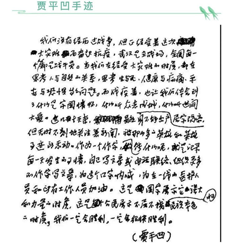“我們沒有經(jīng)歷過戰(zhàn)爭(zhēng),但正經(jīng)受著這次大災(zāi)難而奮起抗疫。武漢是主戰(zhàn)場(chǎng),全國(guó)每一個(gè)人都是戰(zhàn)斗員。當(dāng)我們?cè)诮?jīng)受大災(zāi)難的時(shí)刻,都在思考人與自然的關(guān)系,思考生與還、健康與病痛、不安與恐懼的問題。”大疫當(dāng)前,親自擔(dān)任《共同戰(zhàn)“疫”》專刊主編的著名作家賈平凹撰文寫道。