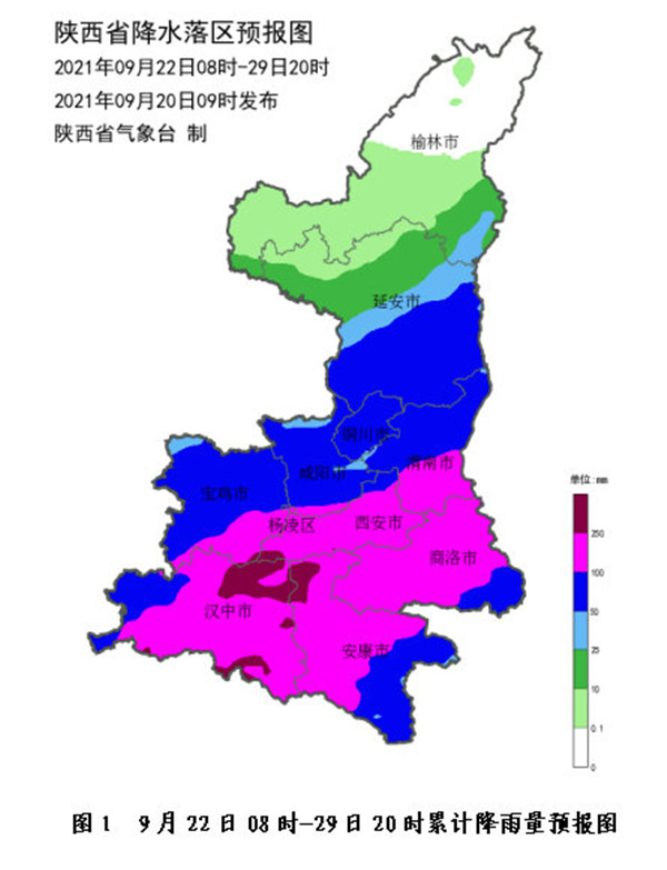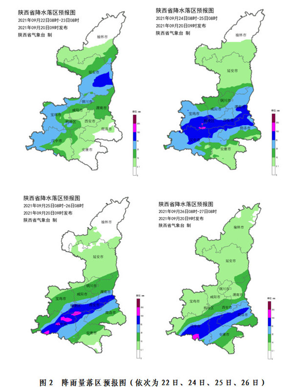 受副高外圍暖濕氣流和高空槽共同影響,22日白天起我省將開始新一輪持續(xù)性陰雨天氣,預(yù)計將維持至月底。過程期間有3個以上暴雨日,其中22日強降水主要位于陜北南部、關(guān)中西部、陜南西部,以大到暴雨為主;24-26日強降水主要位于關(guān)中、陜南地區(qū),部分地區(qū)有暴雨,不排除局地出現(xiàn)大暴雨的可能性;27日至月底強降水主要位于陜南地區(qū)。過程累計降水量:陜北中北部5~40毫米;延安南部、關(guān)中北部60~80毫米,局地可達100毫米以上;關(guān)中南部、陜南大部100~200毫米,局地可達200~300毫米(圖1)。降水前期間具有對流性質(zhì),預(yù)計局地最大小時雨強20~40毫米。