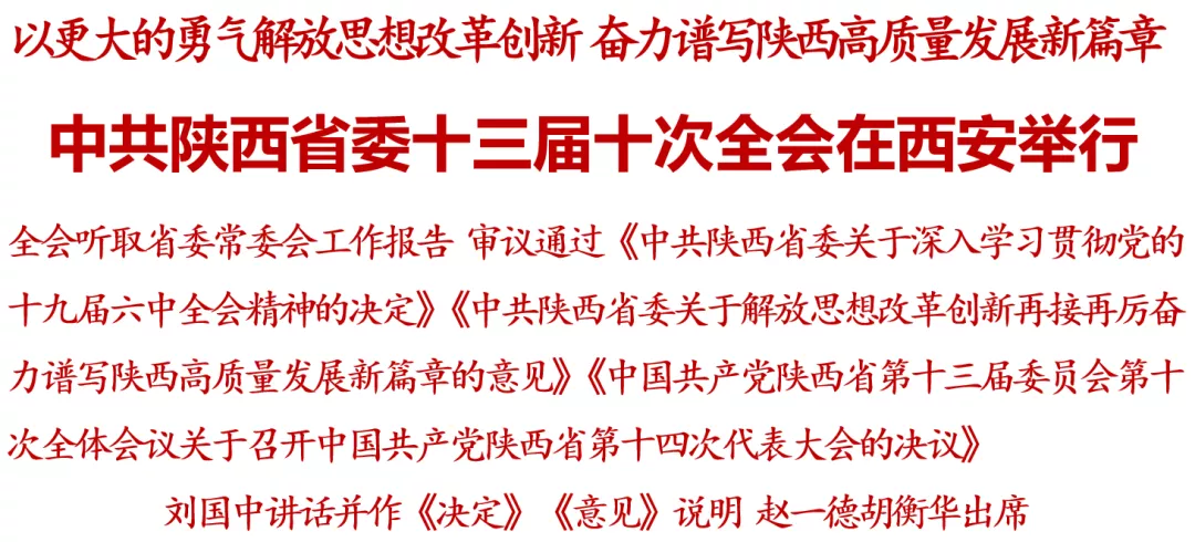 全會以習(xí)近平新時代中國特色社會主義思想為指導(dǎo),全面貫徹黨的十九大和十九屆二中、三中、四中、五中、六中全會精神,深入學(xué)習(xí)貫徹習(xí)近平總書記“七一”重要講話和來陜考察重要講話重要指示,審議通過《中共陜西省委關(guān)于深入學(xué)習(xí)貫徹黨的十九屆六中全會精神的決定》、《中共陜西省委關(guān)于解放思想改革創(chuàng)新再接再厲奮力譜寫陜西高質(zhì)量發(fā)展新篇章的意見》和《中國共產(chǎn)黨陜西省第十三屆委員會第十次全體會議關(guān)于召開中國共產(chǎn)黨陜西省第十四次代表大會的決議》,總結(jié)今年工作,部署明年任務(wù),達到了統(tǒng)一思想、凝心聚力、明確目標(biāo)、鼓勁加油的目的。