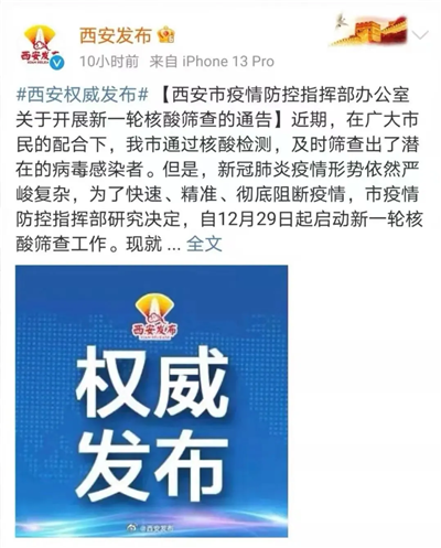 12月29日,西安市疫情防控指揮部辦公室發(fā)布關(guān)于開展新一輪核酸篩查的通告,近期,在廣大市民的配合下,西安市通過(guò)核酸檢測(cè),及時(shí)篩查出了潛在的病毒感染者。但是,新冠肺炎疫情形勢(shì)依然嚴(yán)峻復(fù)雜,為了快速、精準(zhǔn)、徹底阻斷疫情,西安市疫情防控指揮部研究決定,自12月29日起啟動(dòng)新一輪核酸篩查工作。