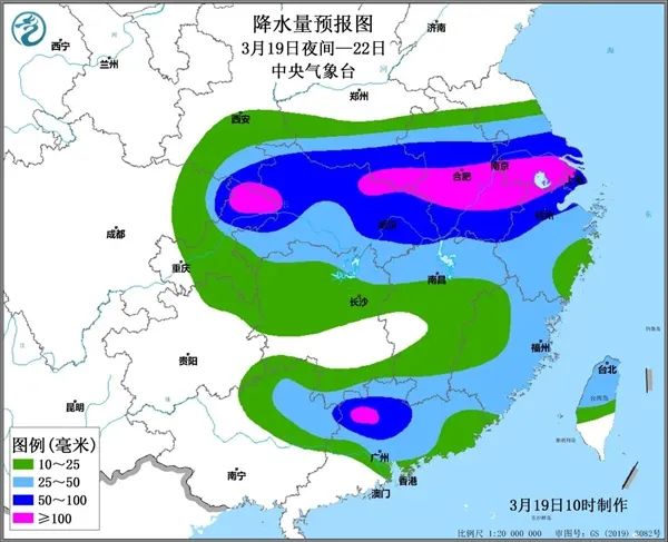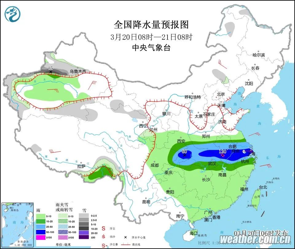 預(yù)計(jì),3月20日08時(shí)至21日08時(shí),四川盆地東北部、陜西東南部、湖北、河南南部、安徽中南部、江蘇南部、上海、浙江北部等地有大雨,其中,重慶北部、陜西東南部、湖北北部和東部、河南東南部、安徽中部和西南部、江蘇南部、上海、浙江北部等地部分地區(qū)有暴雨,局地有大暴雨(100~120毫米),上述部分地區(qū)伴有短時(shí)強(qiáng)降水(最大小時(shí)降雨量20~40毫米,局地可超過50毫米),局地有雷暴大風(fēng)或冰雹等強(qiáng)對(duì)流天氣。