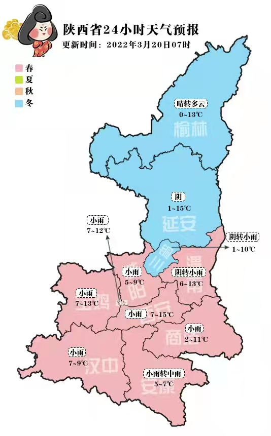 預(yù)計(jì)今天白天:陜北多云間陰天,關(guān)中、陜南陰天,關(guān)中南部、陜南北部有小雨,陜南南部有中雨,局地有大雨,秦巴山區(qū)部分地方有雨夾雪或小雪。