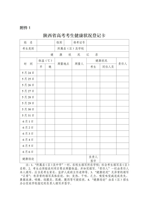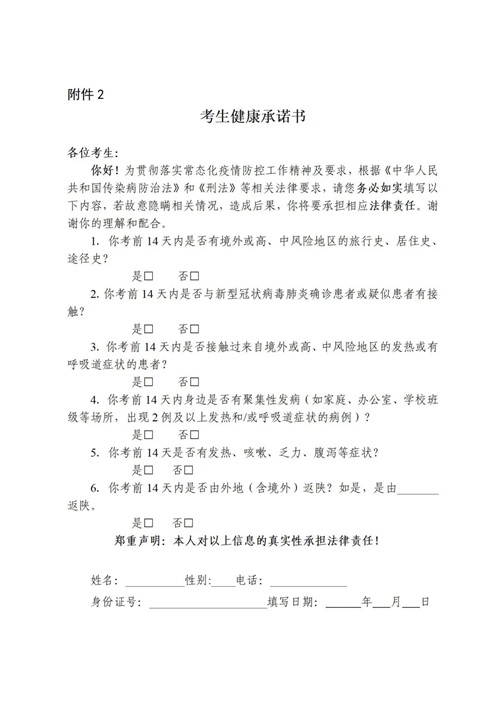 健康監(jiān)測。考生在高考前14天到高考結束應進入靜態(tài)管理,堅持做到非必要不流動,不到人群流動性較大的場所活動,不接觸有疫情風險的人員,做好每日體溫測量、記錄并進行健康狀況監(jiān)測,填寫《陜西省高考考生健康狀況登記卡》(附件1)和《考生健康承諾書》(附件2)?忌】等绯霈F(xiàn)異常狀況應立即向學校和高考報名地考試機構報告,不得謊報、瞞報。
