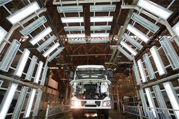 5月24日,在陜西汽車控股集團有限公司總裝車間,一輛裝配完畢的陜汽重型卡車等待驗收。新華社記者 李一博 攝