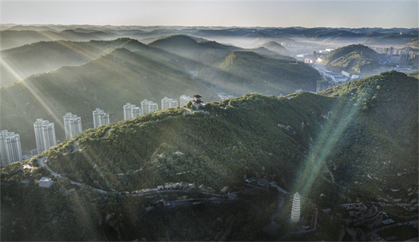 這是2019年8月29日拍攝的被綠色環(huán)繞的陜西省延安市寶塔山(無人機照片)。新華社記者 陶明 攝