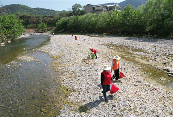 4月10日,女子志愿護河隊隊員在陜西省旬陽市雙河鎮(zhèn)高坪社區(qū)河邊撿拾垃圾(無人機照片)。新華社記者 邵瑞 攝
