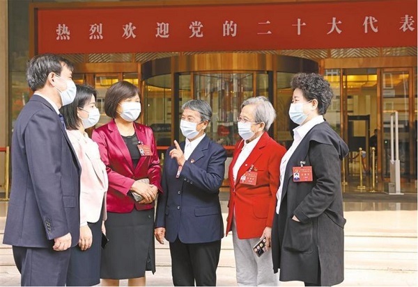 十月十四日,出席黨的二十大的陜西代表王友民、何菲、常亞瓊、張蓮蓮、路生梅、王照輝(左起)在住地交流履職感想。代表們一致表示,將堅(jiān)決扛起政治責(zé)任,以飽滿的熱情認(rèn)真履行好神圣職責(zé)。