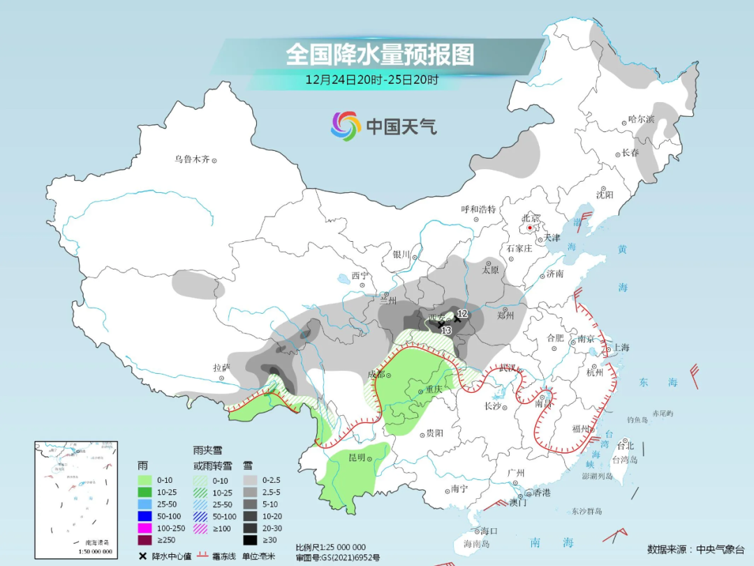 從24日夜間開始,西部地區(qū)的雨雪也將發(fā)展起來。中央氣象臺預計,24日夜間至25日,青藏高原東部、西北地區(qū)東部、華北西南部、黃淮西部、湖北西部、四川西部和北部等地有小到中雪或雨夾雪,局地大到暴雪。