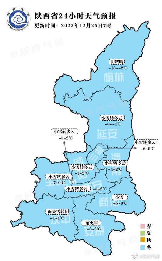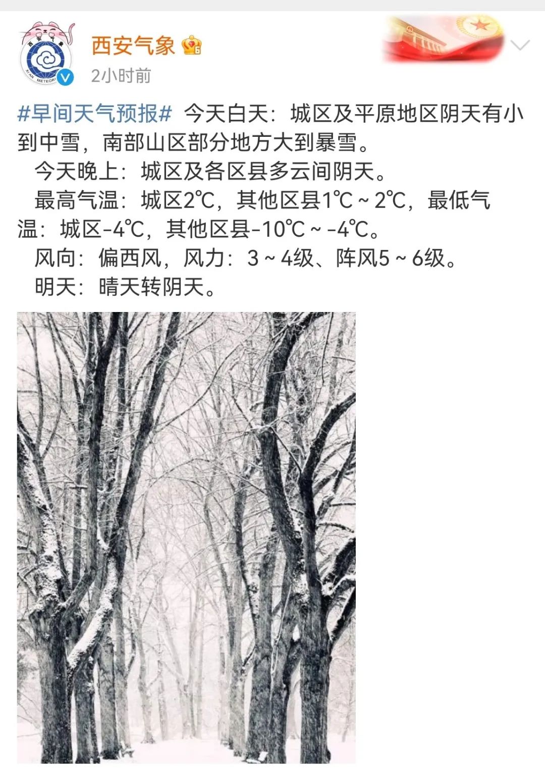 據(jù)陜西氣象最新預報,今天白天:榆林、延安北部陰天轉多云,延安南部、關中北部有小雪,局地有中雪。陜南中西部有雨夾雪或小雪。關中南部、陜南東部有小到中雪,寶雞南部局地、西安南部局地、渭南南部局地、商洛北部局地、秦巴山區(qū)局地有大到暴雪。陜北西部、關中西部、陜南中西部、秦巴山區(qū)日平均氣溫下降 4-6℃。陜北有 4-5 級偏北風。早上關中中西部、陜南西部、秦嶺山區(qū)有輕霧。