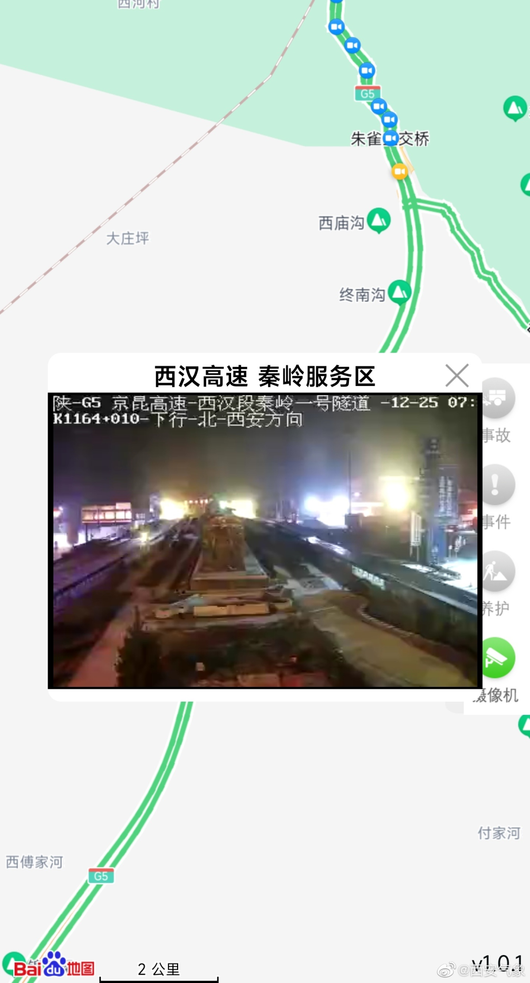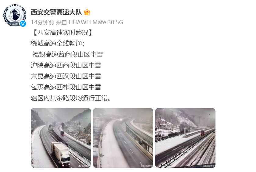 繞城高速全線暢通;福銀高速藍商段山區(qū)中雪;滬陜高速西商段山區(qū)中雪 ;京昆高速西漢段山區(qū)中雪;包茂高速西柞段山區(qū)中雪;轄區(qū)內其余路段均通行正常。
