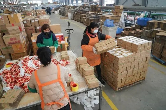 2月6日,陜西美農(nóng)網(wǎng)絡(luò)科技有限公司的工人在物流倉內(nèi)打包食品快遞包裹。(新華社記者邵瑞 攝)