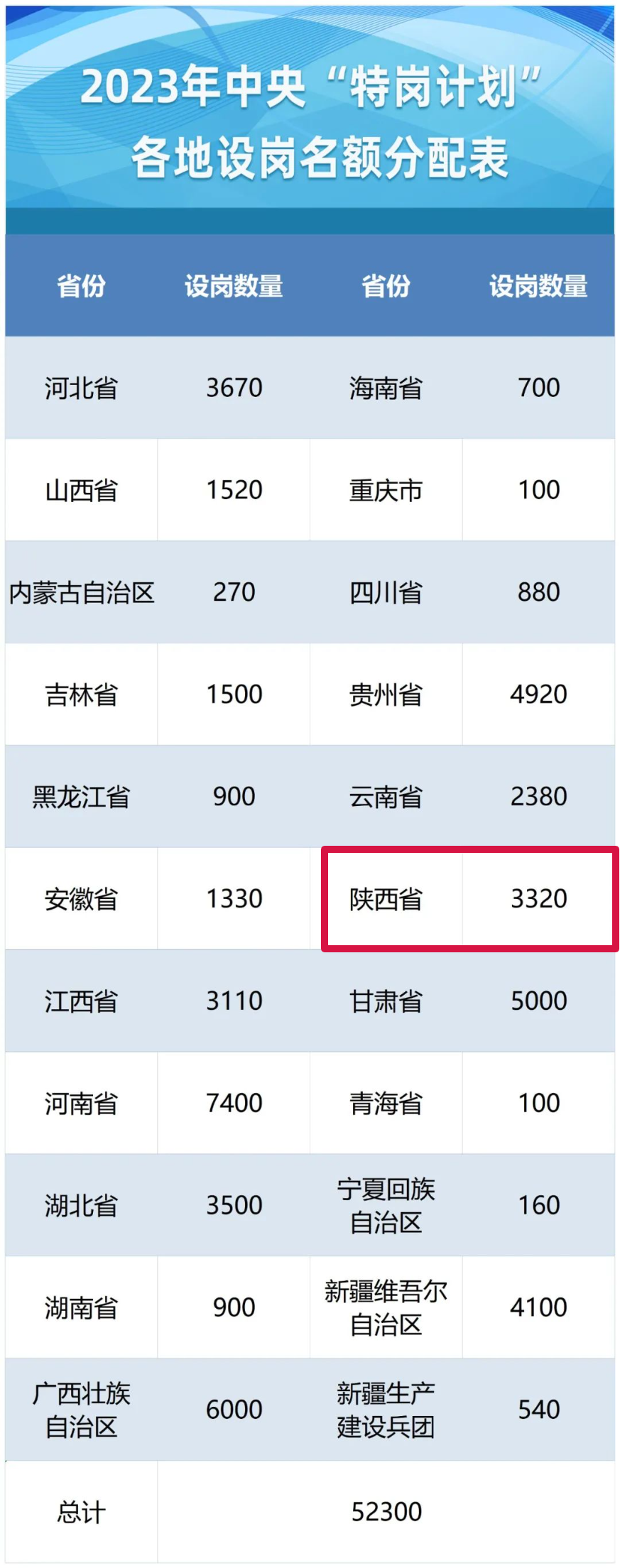 為深入貫徹黨的二十大精神,進一步落實《中共中央 國務(wù)院關(guān)于全面深化新時代教師隊伍建設(shè)改革的意見》,加強新時代教師隊伍建設(shè),實現(xiàn)鞏固拓展脫貧攻堅成果同鄉(xiāng)村振興有效銜接,教育部、財政部近日聯(lián)合印發(fā)《關(guān)于做好2023年農(nóng)村義務(wù)教育階段學(xué)校教師特設(shè)崗位計劃實施工作的通知》,全國計劃招聘特崗教師52300名,其中陜西招聘3320名。分配表如下→