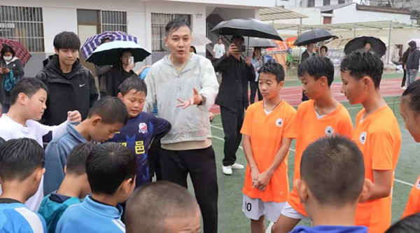 前國腳徐陽在雨中指導(dǎo)小球員。