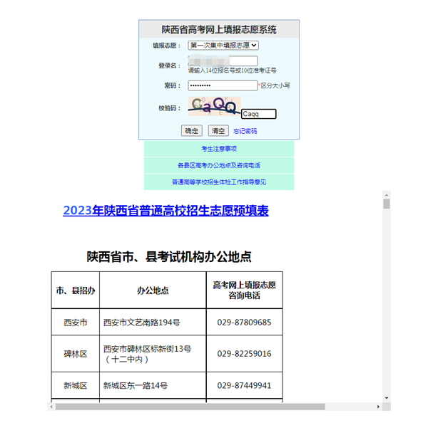 1.考生憑網(wǎng)上報(bào)名時(shí)所用報(bào)名號(hào)(14位)或準(zhǔn)考證號(hào)(10位)及密碼登錄網(wǎng)上填報(bào)志愿系統(tǒng),網(wǎng)址為陜西省教育考試院門戶網(wǎng)站(https://www.sneea.cn)或陜西招生考試信息網(wǎng)(https://www.sneac.com)。