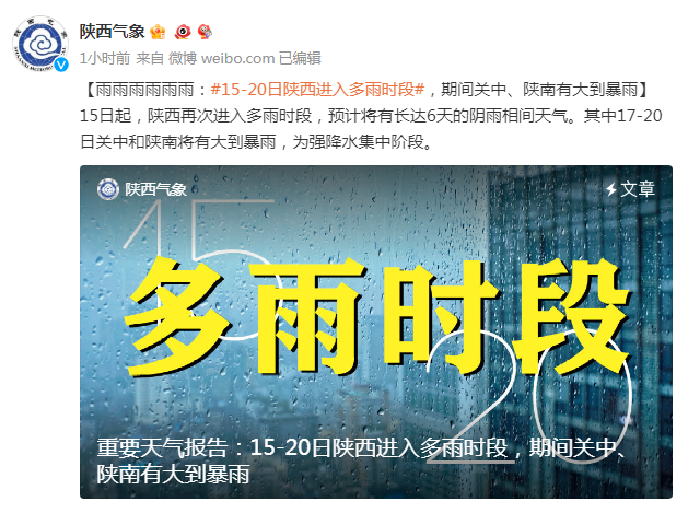 9月12日,陜西省氣象臺發(fā)布重要天氣報告,15-20日陜西進(jìn)入多雨時段