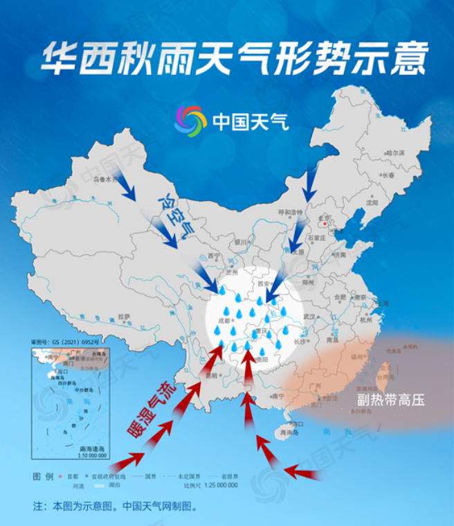華西秋雨是我國華西地區(qū)秋季(9-11月)特有的天氣現(xiàn)象。秋季,頻繁南下的冷空氣與暖濕空氣在該地區(qū)相遇,使鋒面活動加劇而產(chǎn)生較長時間的陰雨天氣。主要影響區(qū)域?yàn)樗拇、重慶、貴州、寧夏南部、甘肅東部和南部、陜西南部及湖南西部、湖北西部等地。