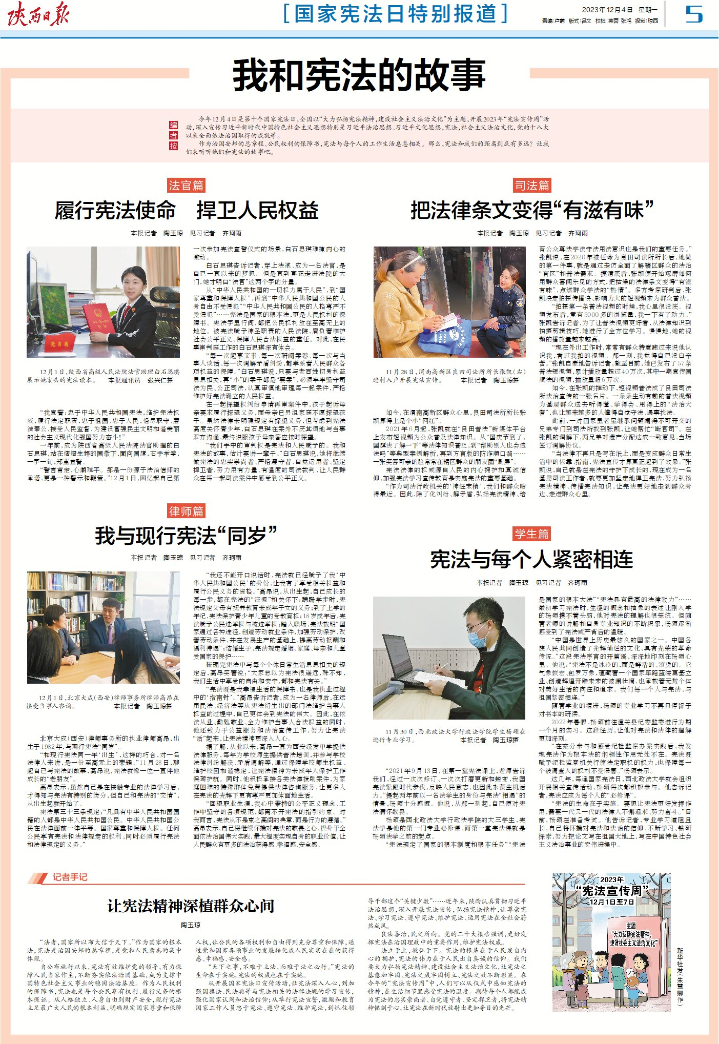 從開展國家憲法日宣傳活動(dòng),讓憲法深入人心,到加強(qiáng)國旗法、民法典等與憲法相關(guān)的法律法規(guī)的學(xué)習(xí)宣傳,強(qiáng)化國家認(rèn)同和法治信仰;從舉行憲法宣誓,激勵(lì)和教育國家工作人員忠于憲法、遵守憲法、維護(hù)憲法,到抓住領(lǐng)導(dǎo)干部這個(gè)“關(guān)鍵少數(shù)”……近年來,陜西認(rèn)真貫徹習(xí)近平法治思想,深入開展憲法宣傳,弘揚(yáng)憲法精神,讓尊崇憲法、學(xué)習(xí)憲法、遵守憲法、維護(hù)憲法、運(yùn)用憲法在全社會(huì)蔚然成風(fēng)。