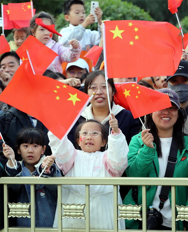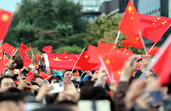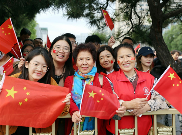 隨后,在《歌唱祖國》的奏樂中,人們揮舞著手中的國旗,盡情唱響愛國贊歌,表達愛國之情。