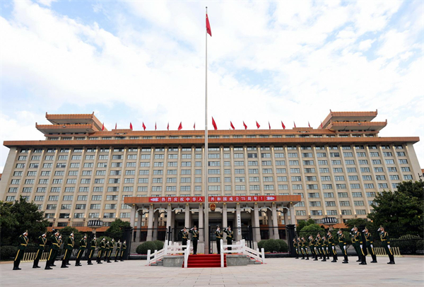 國旗護衛(wèi)隊隊員邁著鏗鏘有力的步伐,護送國旗至升旗臺。