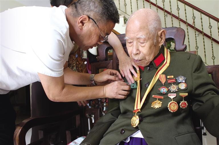8月22日,99歲的我省抗戰(zhàn)老戰(zhàn)士劉炳榮佩戴國家頒發(fā)的“中國人民抗日戰(zhàn)爭勝利80周年”紀(jì)念章。 本報(bào)通訊員 吳寬宏攝