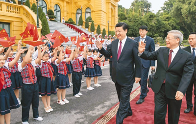 習(xí)近平強(qiáng)調(diào),中越是山水相連的好鄰居、榮辱與共的好朋友、志同道合的好同志、合作共贏的好伙伴。中越建交67年來,由毛澤東主席、胡志明主席等兩國老一輩領(lǐng)導(dǎo)人親手締造和精心培育的中越傳統(tǒng)友誼不斷得到鞏固、弘揚(yáng)。今年以來,兩黨兩國高層保持密切接觸,各領(lǐng)域合作不斷深化,中越關(guān)系取得積極進(jìn)展。當(dāng)前,中越兩國均處在改革發(fā)展的關(guān)鍵階段,兩國各自建設(shè)事業(yè)和雙邊關(guān)系發(fā)展面臨難得的歷史性機(jī)遇。雙方要以兩黨兩國關(guān)系大局為重,從兩國人民根本利益出發(fā),弘揚(yáng)風(fēng)雨同舟的優(yōu)良傳統(tǒng),不斷開創(chuàng)中越關(guān)系新局面,在前進(jìn)道路上和衷共濟(jì)、共謀發(fā)展。