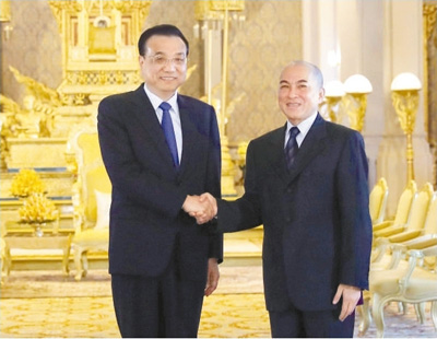 國(guó)務(wù)院總理李克強(qiáng)當(dāng)?shù)貢r(shí)間1月11日中午在金邊王宮會(huì)見柬埔寨國(guó)王西哈莫尼。