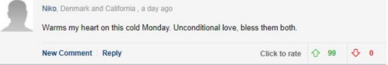 網(wǎng)友Niko:“在這個(gè)冰冷的周一,他們之間無條件的愛讓我感覺到了溫暖。祝福他們!