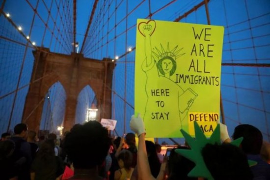 2017年9月5日,在美國(guó)紐約,民眾游行抗議總統(tǒng)特朗普廢除“童年抵美者暫緩遣返”計(jì)劃。(新華社/路透)