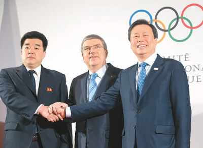 | 圖為1月20日,韓國(guó)代表團(tuán)團(tuán)長(zhǎng)都鐘煥(右)和朝鮮代表團(tuán)團(tuán)長(zhǎng)金一國(guó)在國(guó)際奧委會(huì)主席巴赫(中)主持的歡迎儀式上握手。當(dāng)日,國(guó)際奧委會(huì)就朝鮮參加平昌冬奧會(huì)具體事宜在瑞士洛桑舉行會(huì)議。新華社記者 徐金泉攝 |