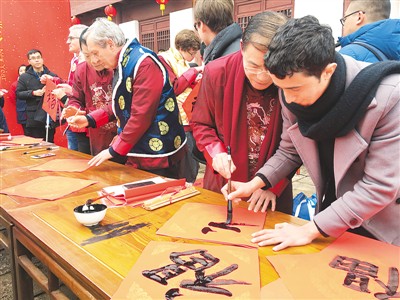 在這次體驗活動的現(xiàn)場,不僅有查理這種第一次來到中國的國際友人,也有像夏波波這樣在中國已經(jīng)待上一段時間的老朋友。來到中國一年半,夏波波坦言,“我住在廣州市中心區(qū)域,平時見不到這么多有意思的傳統(tǒng)事物。來到青田,才第一次見識了中國傳統(tǒng)的新年!备吒邟炱鸬募t燈籠、門楣上貼著的紅對聯(lián),還有各式口味的地方小吃,都讓他感到無比新奇!暗谝淮螌憣β(lián)有點難,但是我寫得很開心。中國的新年很熱鬧,你看,這里的所有人都玩得很開心,我喜歡這樣的氛圍!