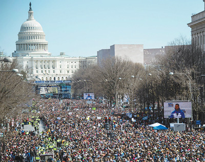 全美大游行是上月14日美國佛羅里達州帕克蘭市校園槍擊案幸存者發(fā)起的。早在數天前,組織方就專門建起了網站,在社交媒體廣泛呼吁。24日一大早,連接白宮和國會大廈的賓夕法尼亞大道上擠滿了從各地趕來的學生。他們高舉標語“保護孩子,而不是保護槍支”“從全國步槍協(xié)會拿錢,對我們來說意味著死亡”“不能再有槍支受害者”“國會不需要槍支,需要勇氣”……示威組織方聲稱約有50萬人參加了在華盛頓的集會和游行。據華盛頓地鐵運營商的統(tǒng)計,當天有約33萬人乘坐了地鐵。與此前的反槍支暴力游行不同的是,24日的示威人群多數是中小學生。
