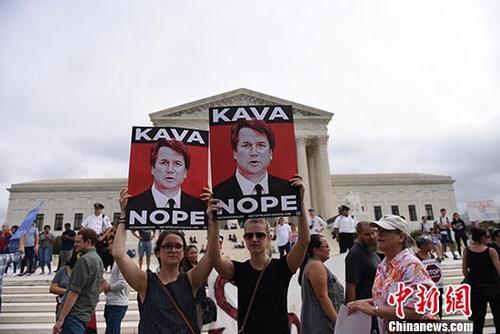 當(dāng)?shù)貢r(shí)間10月6日,美國(guó)民眾在華盛頓的最高法院門前集會(huì),反對(duì)卡瓦諾擔(dān)任最高法院大法官。當(dāng)天,美國(guó)參議院最終投票確認(rèn)卡瓦諾出任聯(lián)邦最高法院大法官。 中新社記者 鄧敏 攝