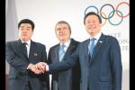 圖為1月20日,韓國(guó)代表團(tuán)團(tuán)長(zhǎng)都鐘煥(右)和朝鮮代表團(tuán)團(tuán)長(zhǎng)金一國(guó)在國(guó)際奧委會(huì)主席巴赫(中)主持的歡迎儀式上握手。……