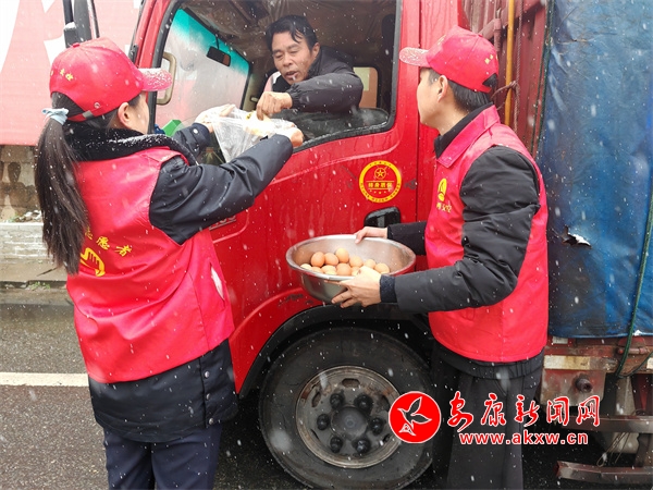 2月21日上午,降雪導(dǎo)致十天高速道路封閉,部分司機(jī)和乘客滯留在白河服務(wù)區(qū),陜西交控集團(tuán)白泉分公司白河管理所組織青年志愿者為滯留司乘送去饅頭、雞蛋、姜湯等食物,讓滯留人員感受到了溫暖。(通訊員 張丹) eQt安康新聞網(wǎng)
