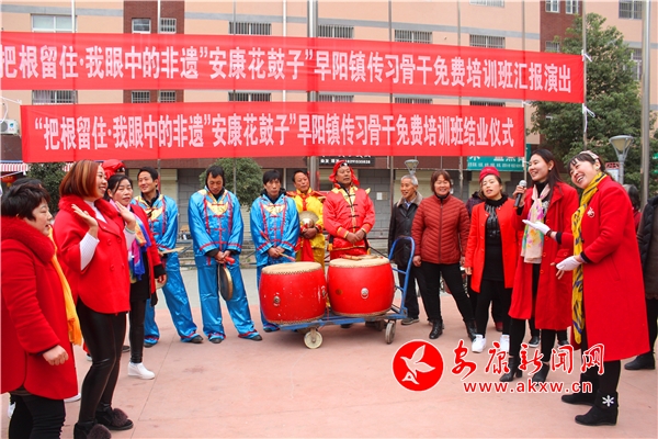 安康新聞網(wǎng)訊(通訊員 周濤 胡德良)12月23日,“把根留住•我眼中的非遺”“安康花鼓子”早陽鎮(zhèn)傳習骨干免費培訓匯報演出暨結業(yè)儀式在漢濱區(qū)早陽鎮(zhèn)共進社區(qū)舉行, 22名學員通過嚴格考核后順利結業(yè),這也是漢濱區(qū)文化館、漢濱區(qū)非物質(zhì)文化遺產(chǎn)保護中心首次將省級非物質(zhì)文化遺產(chǎn)保護項目——“安康花鼓子”免費培訓延伸到鄉(xiāng)鎮(zhèn)。