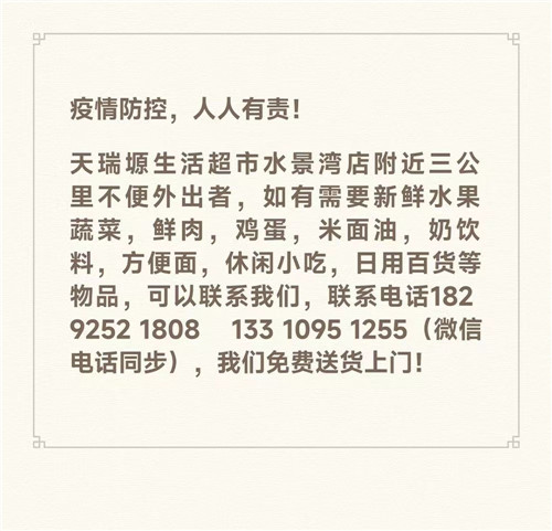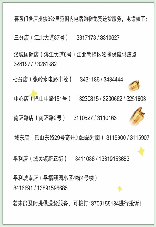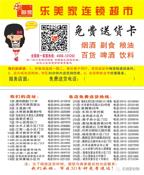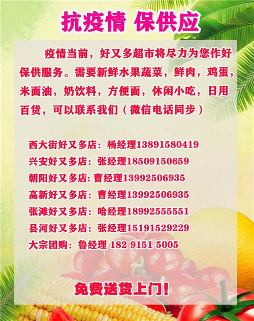 為滿足廣大市民群眾生活必需品的購買需求,避免因人群聚集造成的交叉感染風(fēng)險(xiǎn),漢濱區(qū)經(jīng)貿(mào)局組織漢濱中心城區(qū)多家保供企業(yè)(超市)推出免費(fèi)送貨服務(wù),市民朋友可撥打就近購物店電話,各商家將盡心盡力為大家做好服務(wù),解決您的購買需求。PvN安康新聞網(wǎng)