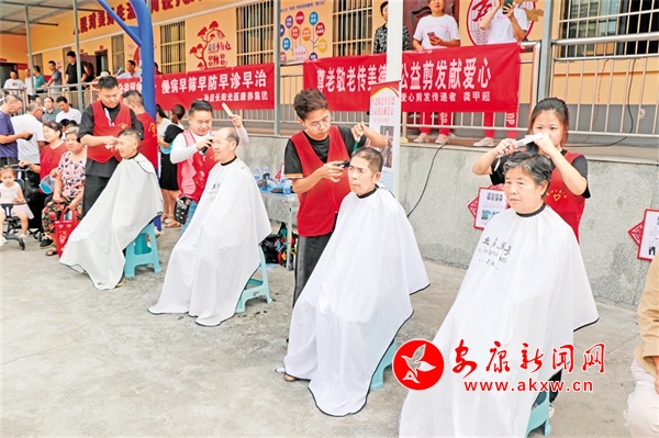 現(xiàn)場,通過有獎問答、發(fā)放宣傳資料、設(shè)立咨詢臺等形式,向村民進(jìn)行平安建設(shè)、普法、反詐等宣傳。來自漢濱區(qū)陽光愛心護(hù)理院的志愿者們?yōu)槔先藗兲峁┙】抵笇?dǎo)。愛心人士龔甲超組織的義剪活動也受到了老人們的歡迎,志愿者們免費為現(xiàn)場50多名老人理發(fā)。書法家們現(xiàn)場圍繞“孝義”主題進(jìn)行創(chuàng)作,并贈送給群眾。演出結(jié)束后,近百名老人到社區(qū)的孝義食堂參觀和免費用餐。