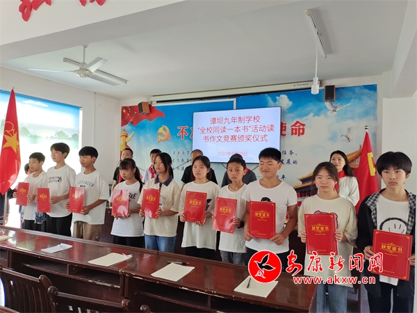 當(dāng)天,安康市書香少兒讀書會(huì)攜手愛心人土,在譚壩九年制學(xué)校舉行了“全校同讀一本書”活動(dòng)的閱讀體會(huì)作文競(jìng)賽頒獎(jiǎng)儀式,向50名優(yōu)秀作文獲獎(jiǎng)學(xué)生、4名優(yōu)秀輔導(dǎo)老師頒發(fā)了獲獎(jiǎng)證書和獎(jiǎng)品圖書;顒(dòng)的目的是為留守兒童占比高的山鄉(xiāng)學(xué)校送閱讀,促使孩子們“把書讀起來,把心靜下來”,以利安心學(xué)習(xí)、舒心生活、開心成長(zhǎng);顒(dòng)期間,該校師生舉辦了形式多樣的讀書會(huì)、分享會(huì)和交流活動(dòng),書香少兒讀書會(huì)組織愛心專家作了讀書方法、讀后感寫作技巧輔導(dǎo),每個(gè)學(xué)生都參與了閱讀作文競(jìng)賽。