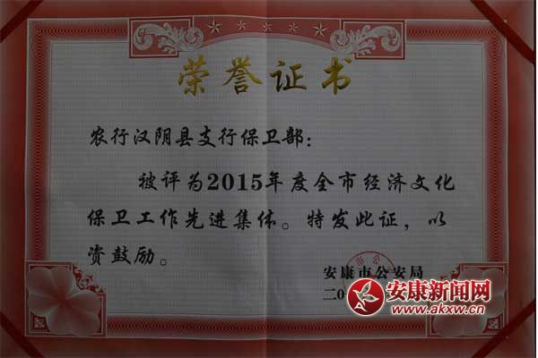 安康新聞網訊 (通訊員 吳玄杰)近日,陜西省公安廳、省綜治委聯(lián)合下發(fā)了《關于命名表彰2015年度全省經文保系統(tǒng)省級“平安示范單位”“平安單位”的決定》,農行漢陰縣支行被授予省級“平安單位”榮譽稱號。同時,安康市公安局下發(fā)了《安康市公安局關于表彰2015年度全市經濟文化保衛(wèi)工作先進集體和先進個人的決定》,農行漢陰縣支行保衛(wèi)部獲得“2015年度全市經濟文化保衛(wèi)工作先進集體”榮譽稱號,保衛(wèi)部經理鄺吉祥同志被市公安局評為“先進個人”。