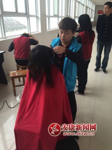 領(lǐng)航公益志愿者在為學(xué)生剪發(fā)