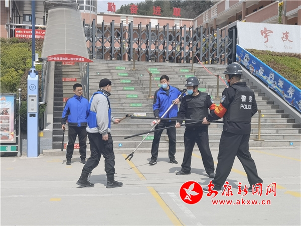 演練開始,下午1點30分,入校音樂響起,兩名校警、家長護衛(wèi)隊、值班老師站在校門口執(zhí)勤,大部分學(xué)生已進入校園,還有十幾名學(xué)生正在排隊等待入校。此時,在學(xué)校旁邊閱讀吧門口徘徊的一名身份不明的“歹徒”突然舉著砍刀沖向校門口,企圖闖入校園,值班校警見狀立即啟動一鍵式報警向公安部門求助,值班老師快速做出反應(yīng),拉響學(xué)校警報,關(guān)閉伸縮門,組織未入校的學(xué)生趕往緊急避難場地躲避。同時,校警和值班老師手持器械,在校門口對“歹徒”進行阻擊,拖延時間。RvL安康新聞網(wǎng)