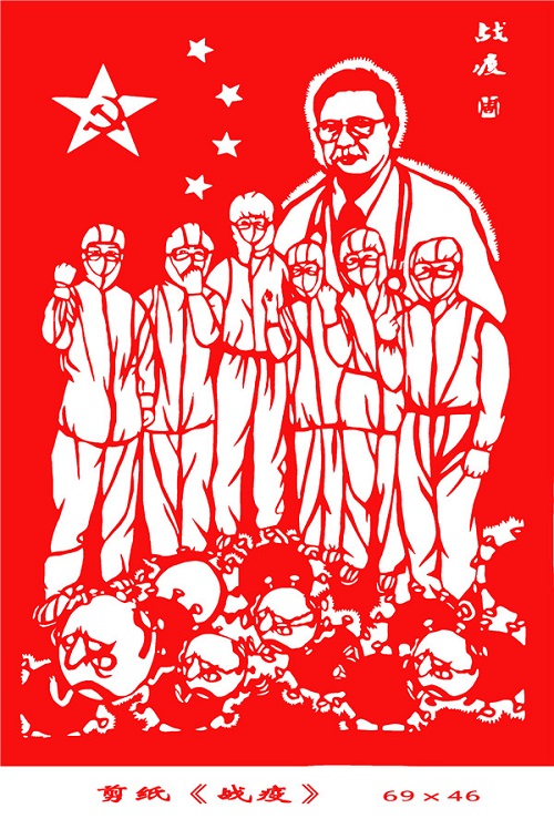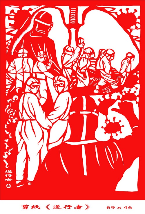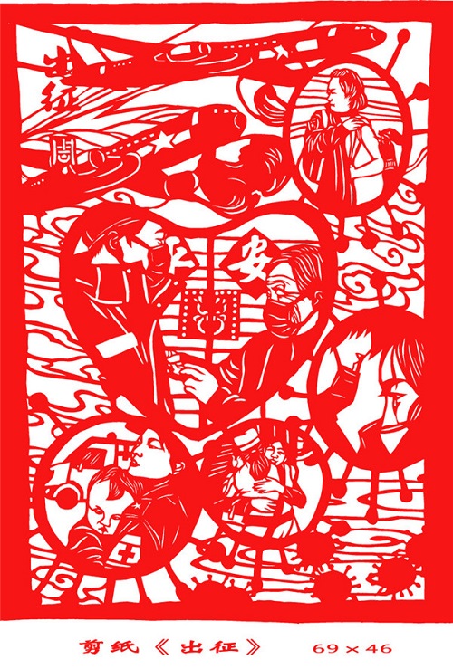 周玉珍作為安康市平利縣的一名小學美術教師,在做好學生、家長疫情防控宣傳教育的同時,戰(zhàn)“疫”中的許多瞬間,令她分外感動。她借個人居家防護的時機,完成了《出征》《逆行者》《戰(zhàn)疫》三幅剪紙作品,用鮮紅的剪紙記錄下了那些令人感動的瞬間。