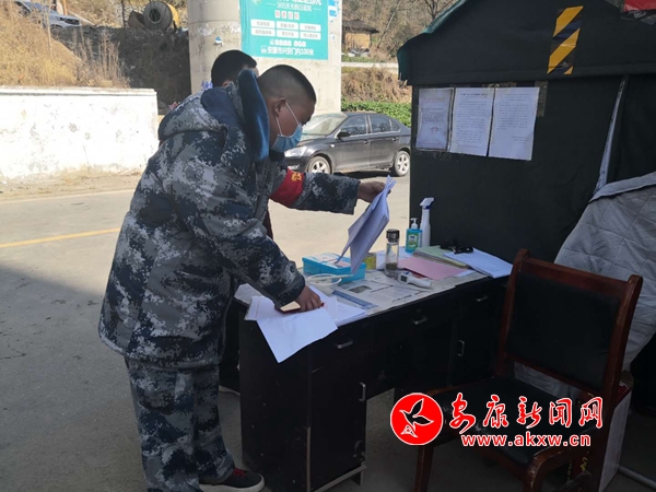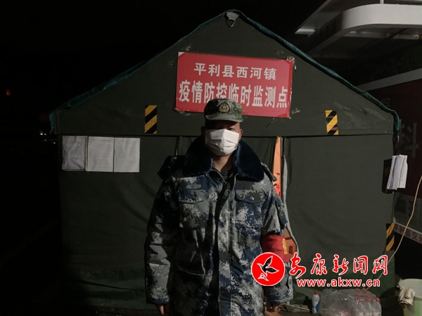 西壩村現(xiàn)役軍人陳玉沈在大疫面前,立書(shū)請(qǐng)戰(zhàn),成為了一名疫情防控志愿者,被分派到平利西河鎮(zhèn)段家河監(jiān)測(cè)勸返點(diǎn),負(fù)責(zé)值班值守,監(jiān)測(cè)勸返。