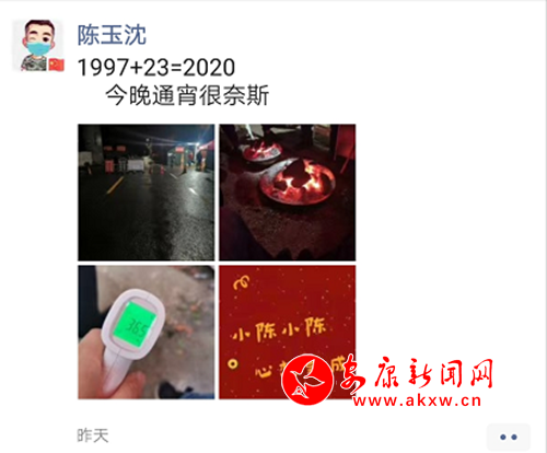陳玉沈被分派防疫一線后,村上干部一直都在關(guān)注他的工作狀況,傍晚的時(shí)候村支部書(shū)記發(fā)現(xiàn)他在朋友圈發(fā)了一句“1997+23=2020,今晚通宵很奈斯”的話后,大家才推斷出,今天是陳玉沈23歲生日,他還在堅(jiān)守崗位,通宵值守。