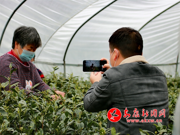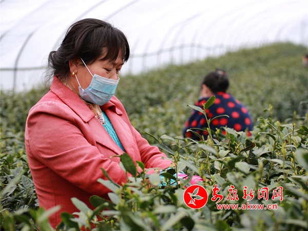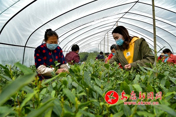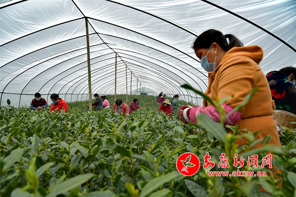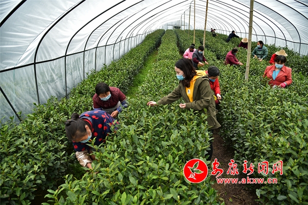 茶園基地,茶農(nóng)一字排開,雙手麻利地采下剛剛冒頭的茶葉嫩芽。