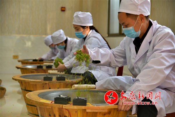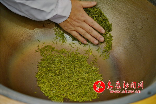 在綠茶生產(chǎn)車間,陣陣茶香撲面而來,沁人心脾。嫩綠的茶芽在制茶師們手中翻飛,炒鍋中響起“噼噼啪啪”的聲音,熱氣縷縷升騰,只見制茶師施展抖、悶、揚(yáng) 、理?xiàng)l、壓、翻等手工制茶動(dòng)作,鮮嫩的茶芽通過殺青、做形、烘干后根根緊直似針,翠綠養(yǎng)眼的新茶即誕生“出爐”。