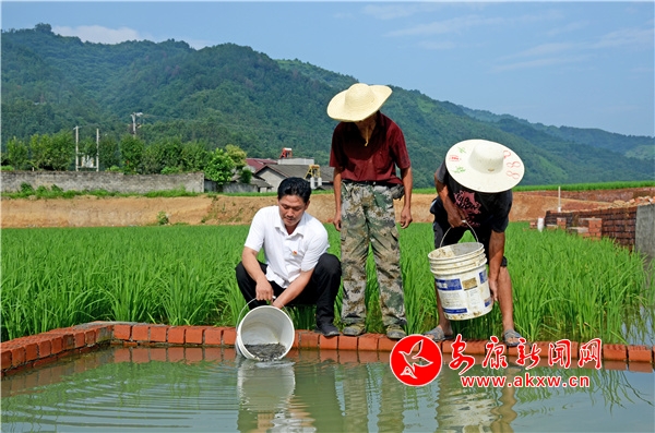 “我家去年種了3畝水稻,投放了50斤魚苗,養(yǎng)大后以40元一斤的價(jià)格賣了2000多元,其余的都分給親戚朋友嘗鮮了。我看到效果不錯(cuò),今年便多種了兩畝水稻,準(zhǔn)備多投放一些魚苗。”領(lǐng)了4桶魚苗的村民賈文林一邊往自家田里放著魚苗一邊說(shuō)道。