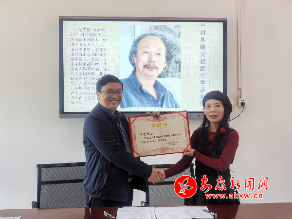 本網(wǎng)訊(通訊員 黃燕)3月18日,平利縣城關(guān)初級中學(xué)舉辦“中國畫壇百杰、平利籍畫家吳光明”書畫作品捐贈儀式。吳光明委托其外甥女王小茜將《黃河的傳說》《天柱地軸》《恒山深處多仙家》等11幅作品捐給城關(guān)初級中學(xué)。tHT安康新聞網(wǎng)